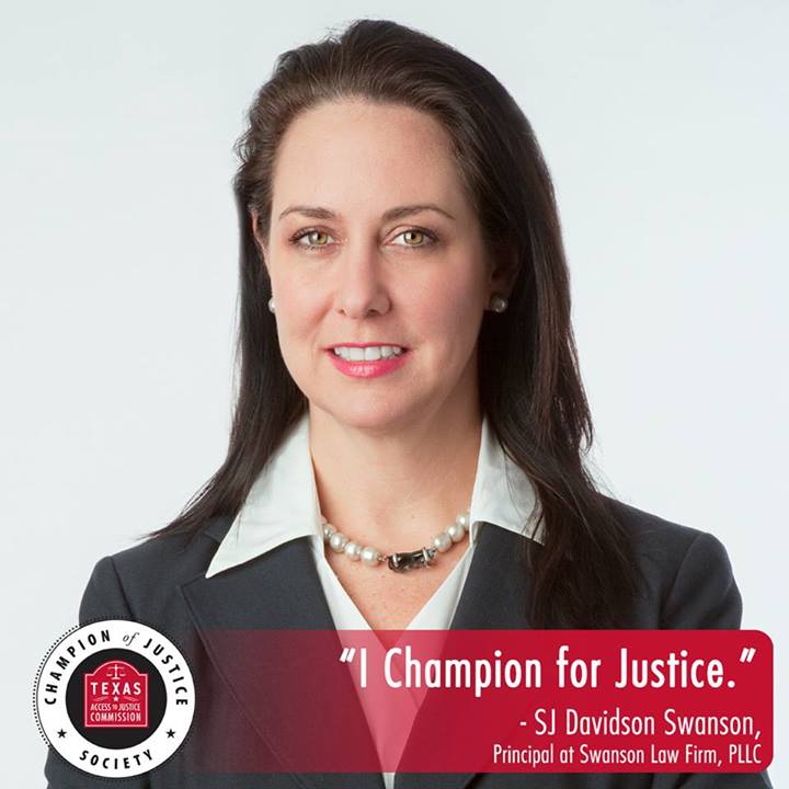 SLF principal SJ Swanson was recognized by the Texas Access to Justice Commission, the leading funding source for legal aid in Texas, for joining the Champions of Justice Society. "I'm happy to support the organization that funds the legal aid office in Houston and across the state", she said. SJ interned with Lone Star Legal Aid in Houston during her last year of law school. She practiced in the litigation section, representing the agencies clients in court with a third year bar card.