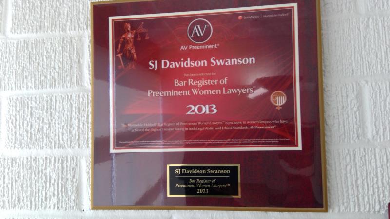 Sarahjane "SJ" Davidson Swanson was recently selected for inclusion into the 2013 Martindale-Hubbell Bar Resister of Preeminent Women Lawyers. The register is exclusively open to women attorneys who have received the highest possible rating in both legal ability and ethical standards from their peers. Less than 5% of women lawyers have been recognized with an AV Preeminent Rating. Swanson has been AV rated every year since 2008, and AV Preeminent rated every year since 2010 when the preeminent designation became available.